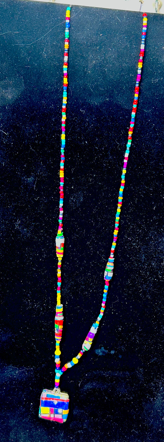 "Kandinsky-Inspired" Handmade SIngle Strand Muti-colored Necklace with Paper Beads Decoupage Pendant & Lobster Claw