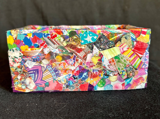 Multi-Colored Psychedelic w/ Red & Yellow Gems Gilded Mod Podge Paper Collage Decorative Arts Wood Crate Handmade 2024 USA