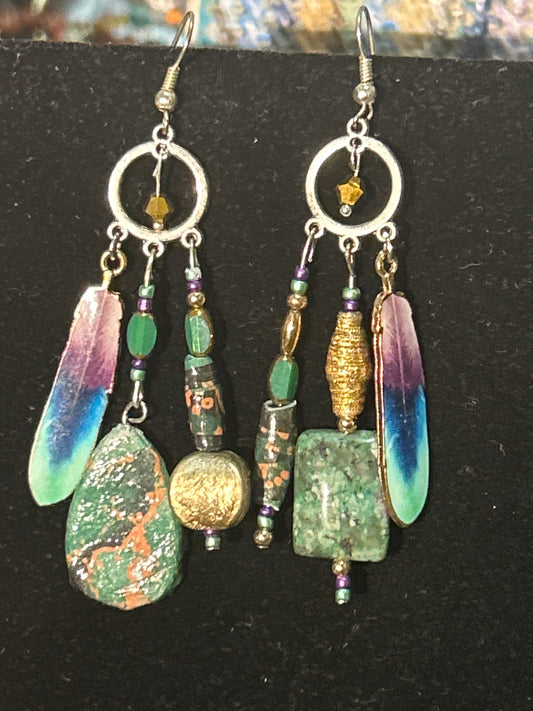 Green & Gold Trim Fly Feather Handmade ChandelEarrings w. Glass, Paper, & Crystal Beads~ original designs, funky unique pretty hypoallergenic