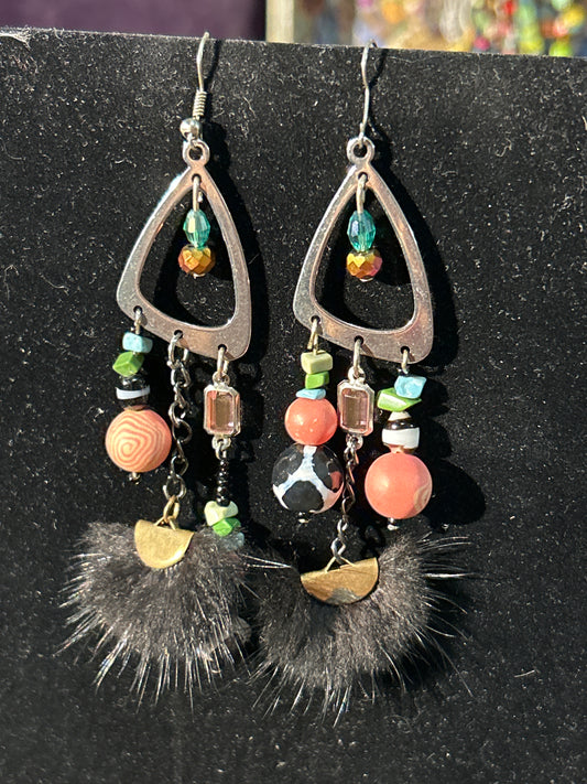 Fuzzy Peach And Green Funhouse Handmade BalanceMatch ChandelEarrings w. Clay, Stone, & Crystak beads ~ original designs funky unique pretty hypoallergenic