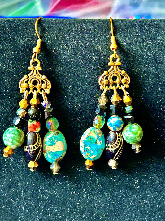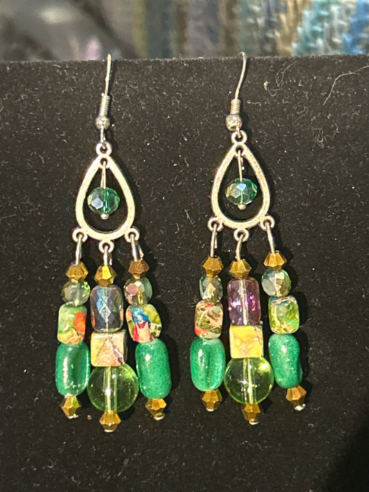 Green & Rainbow Jasper EarthTone Handmade ChandelEarrings w. Glass and Stone Beads~ original designs, funky unique pretty hypoallergenic