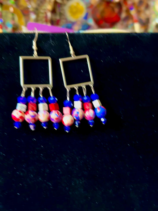 Handmade Red, White and Blue Square 4-Drop ChandelEarrings with Glass, Crystal, and Imperial Jasper Gemstones with Silver Plated Hypoallergenic Findings
