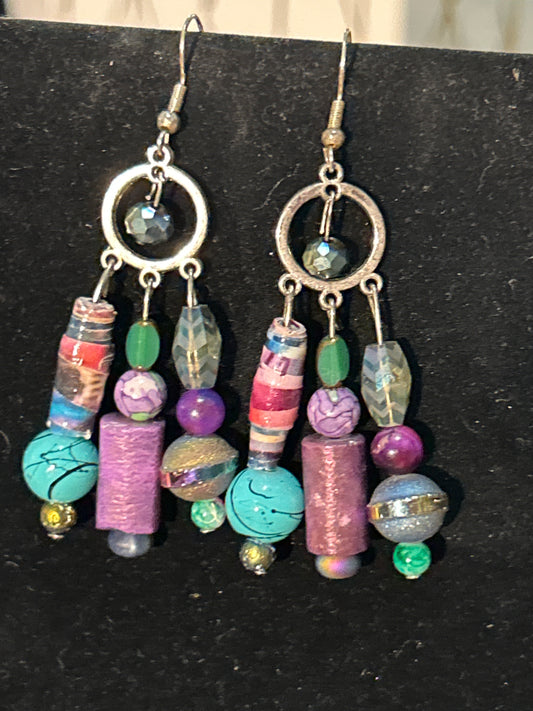 Space Purple & Green Handmade ChandelEarrings w. Glass, Crystal & Paper beads ~ original designs funky unique pretty hypoallergenic findings