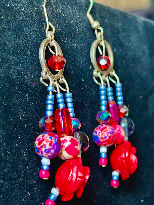 White, Blue and Red Roses ChandelEarrings with Natural Stone, Glass, and Ceramic Rose Beads w. Hypoallergenic Silver-plated findings