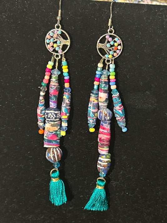 Tree of Life Pastel Tassel Handmade ChandelEarrings w. clay, Paper, & glass Beads~ original designs, funky unique pretty hypoallergenic