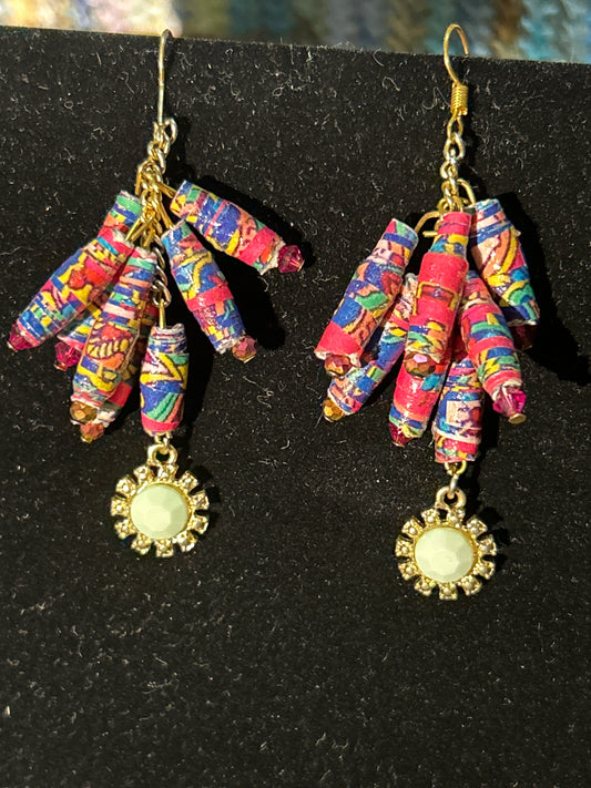 Pink Paisley crystal- tipped Handmade Paper Bead Earrings, Summer Shades, Colorful Cluster Chain earrings, original designs funky unique pretty hypoallergenic