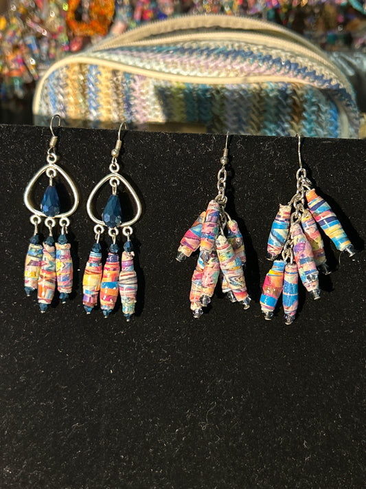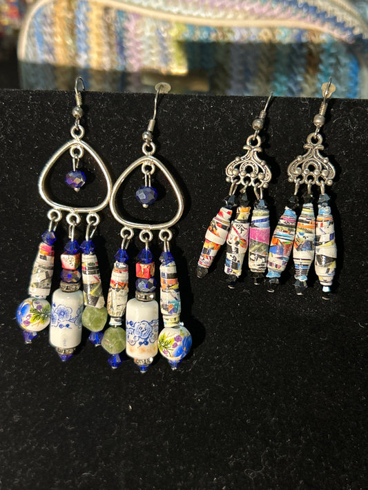Handmade ChandelEarrings w. Paper l, Glass & Gemstone beads ~ original designs funky unique pretty hypoallergenic findings