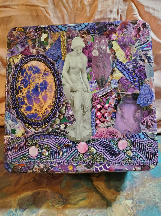 Wall Art Purple Elegant Bead Collage with Porcelain Goddess Statue design Wall Art Decoupage Dynamic Ucycled Tin Lid Handmade