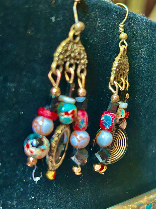 Earth Tones Peacock 3-Drop ChandelEarrings with Natural Stone & Glass Beads w. Hypoallergenic Silver-plated Findings (Copy)