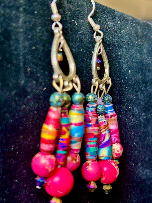 Prettiest Pink 3-Drop ChandelEarrings with Handmade Paper Beads and Natural Stone Beads w. Hypoallergenic Silver-plated Findings