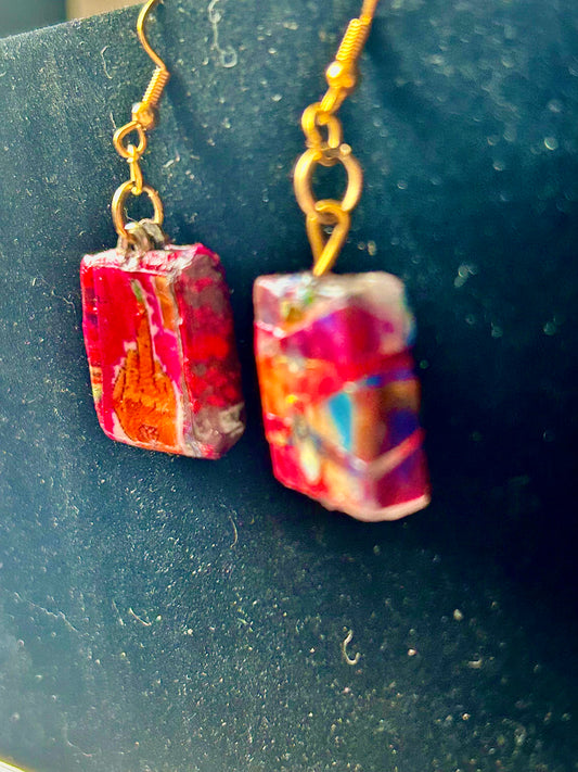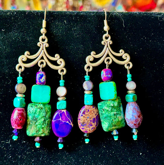 Purple and Greenish Blue Square 4-Drop ChandelEarrings ft. Decoupage Beads, Funky Gemstones and Clay Polymer Beads ~ Hypoallergenic Findings Unique Design