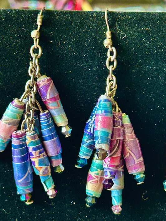 Purple Mermaid Blue Homemade Paper Bead Chain Clusters & ChandelEarring Set & Hypoallergenic Silver-Plated Findings