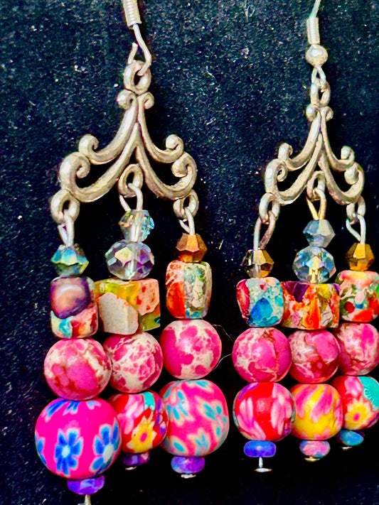 Pink Cream Polymer Clay beads; Imperial Jasper Gemstone ChandelEarrings ~ Handcrafted with 925 SIlver plated Hypoallergenic Findings