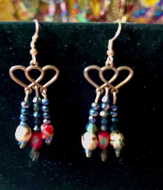 Red, Slate, & Gemstone Speckle White Handcrafted ChandelEarrings with Heart Finding ~ Crystal, Gemstone, & Polymer Clay Beads