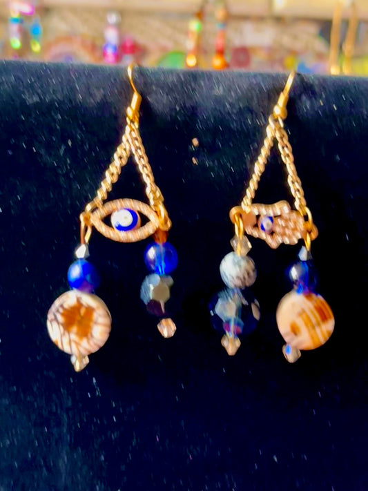 Blue & Gold Hamsa Charm Gold-Plated Chain Earrings, Homecrafted w. Crystal, Glass, and Multi-Colored Paper Bead & Hypoallergenic Silver-Plated Findings