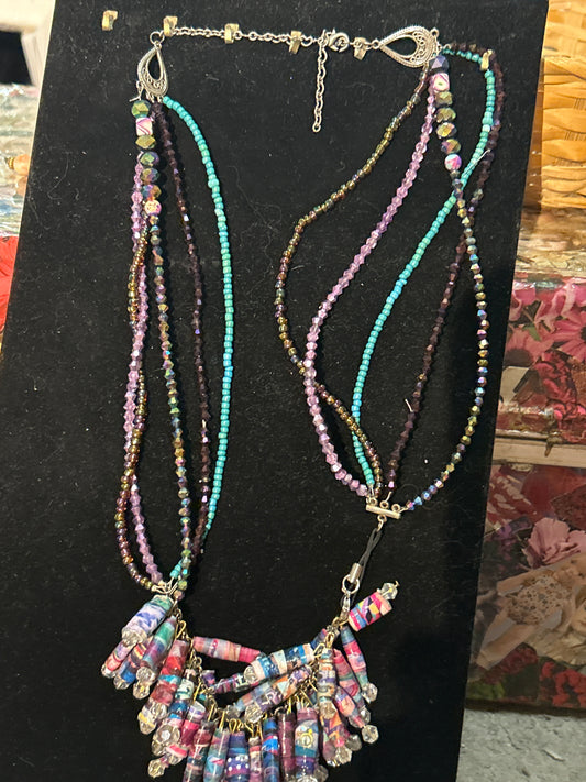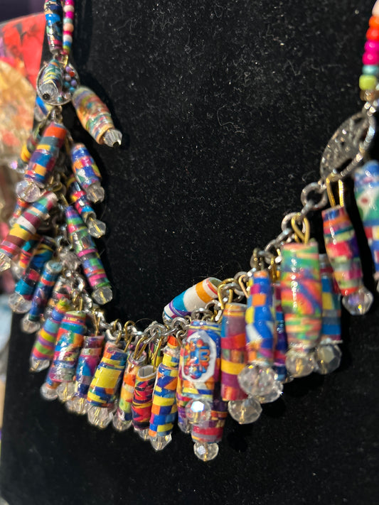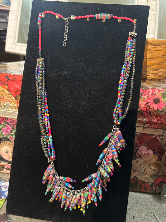 Blue Krobo Style Paper Bead Necklace Multi-Colored Ethnic, Glazed