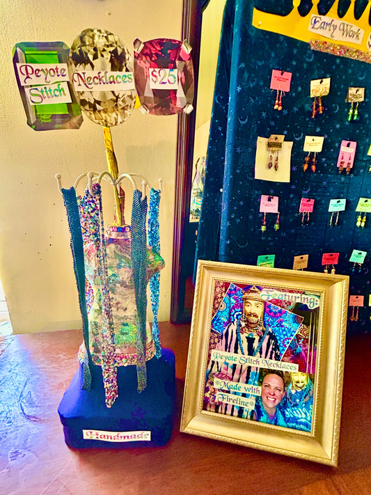 Hi! I'm Amanda Hamlin, the creative brain behind the Prismatic Dynamic Retro-Tech Abstract-Tactile Enhanced Collage. This creative endeavor began over 10 years ago as a solution to beautify the chest which housed my jewelry wares - The Royal Glass Bead Treasure Chest, when hot glue and rhinestones chipped away quick and left my trunk looking tacky, I began to decorate with Images from bead magazines and pictures of bling from books and catalogs, as well as trippy images that I printed to adorn the sides simply using another person artwork and pasting it to my item and calling it my own.