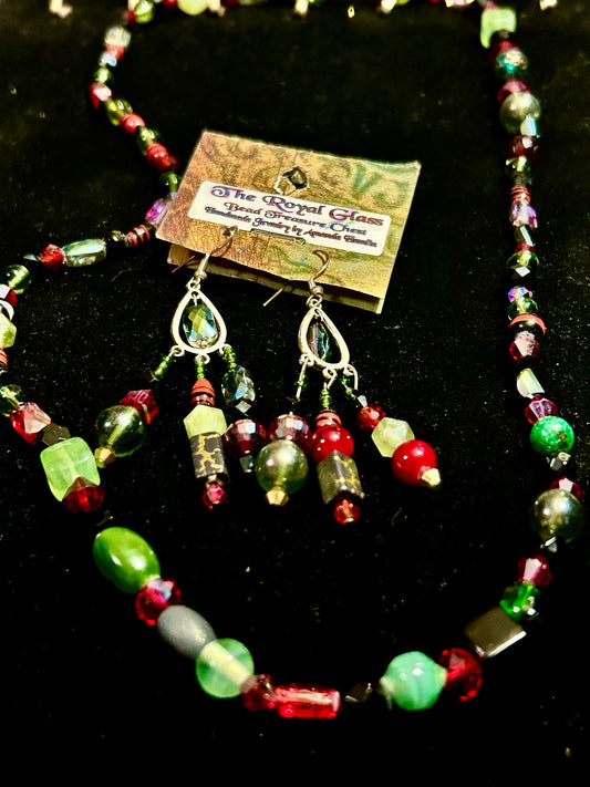 Red and Green & Black Artisan Handcrafted Beaded Necklace & Earring Set ~ Glass, Crystal, Stone Beads Brilliant Unique