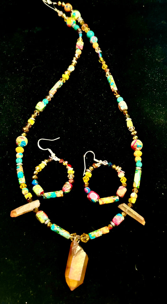 Purple & Orange Artisan Handcrafted Beaded Necklace & Earring Set w. Decoupage Pendant ~ Glass, Crystal, Stone Beads Brilliant Unique