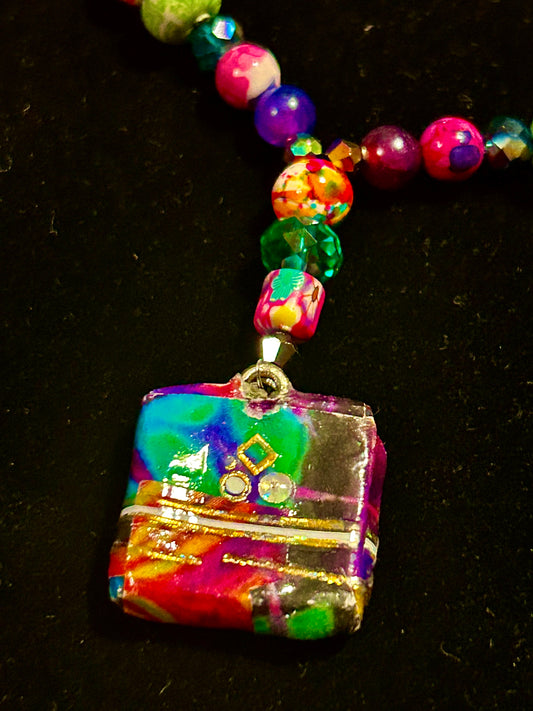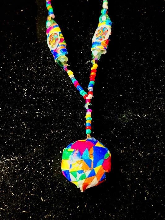 Artisan Handcrafted Beaded Necklace w. Decoupage Abstract Pendant and Handmade Paper Beads with Kandinsky Decals~ Multicolor Seed beads strand