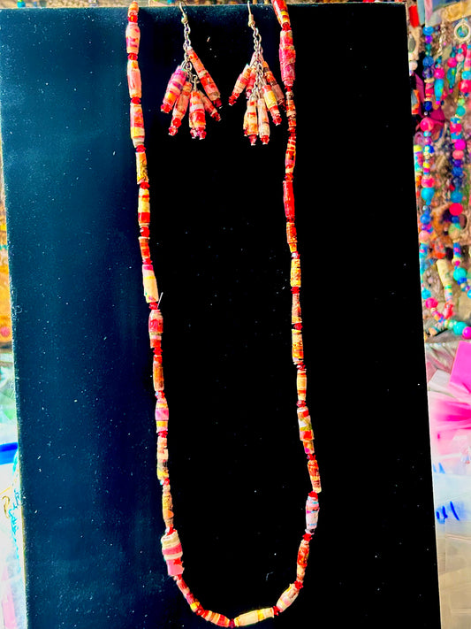 Strawberry Shortcake Artisan Handcrafted Paper Bead Necklace & Earring Set from Upcycled Magazine Paper