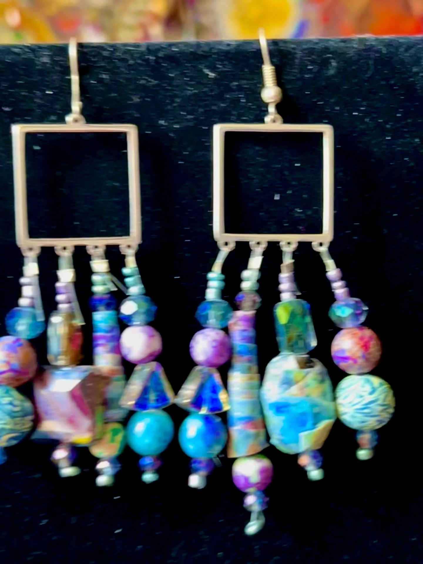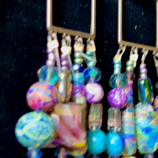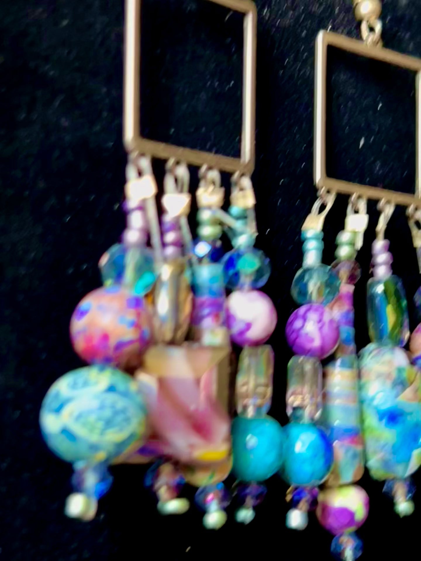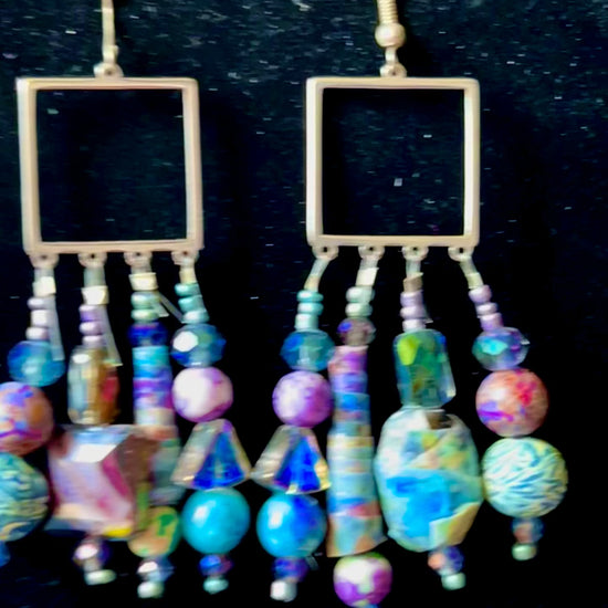 Purple and Greenish Blue Square 4-Drop ChandelEarrings ft. Decoupage Beads, Funky Gemstones and Clay Polymer Beads ~ Hypoallergenic Findings Unique Design